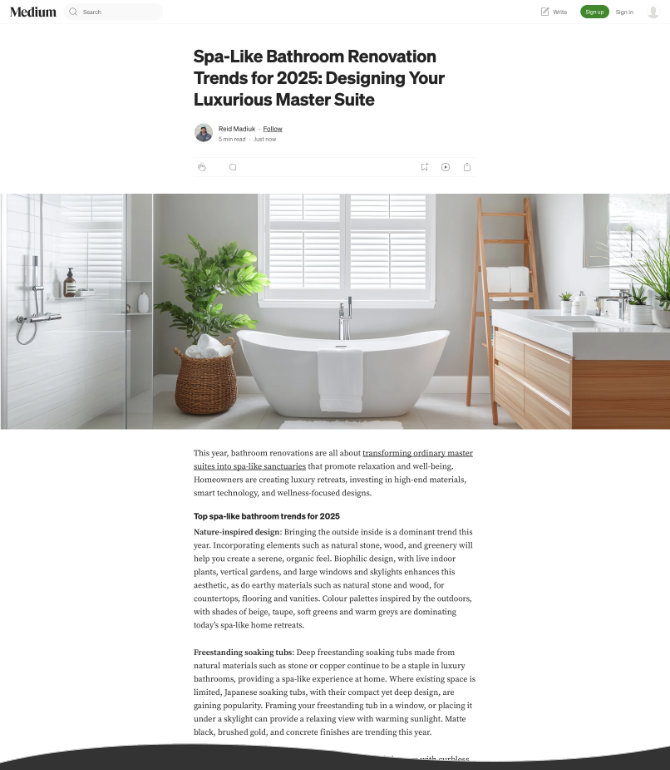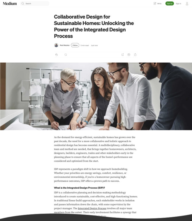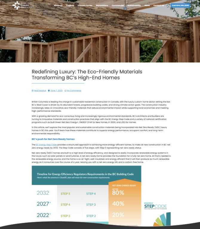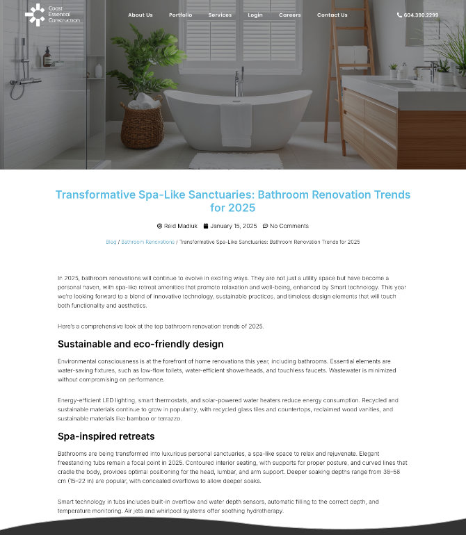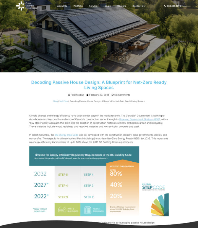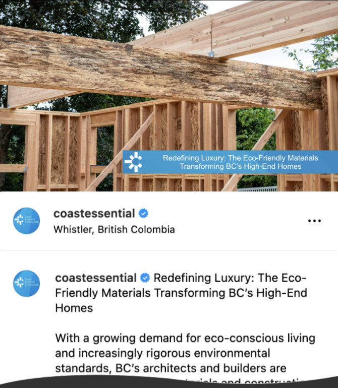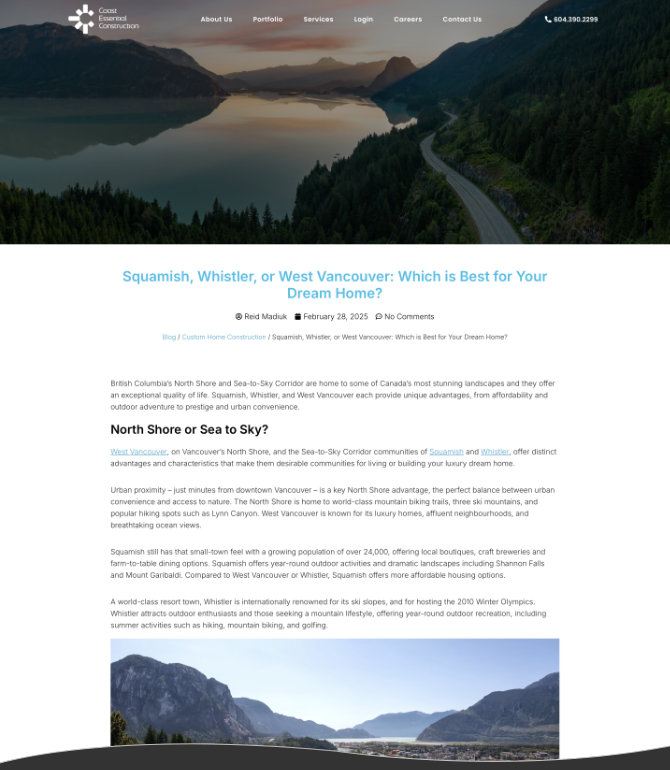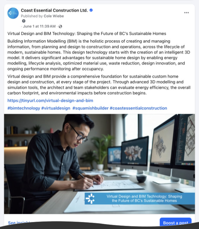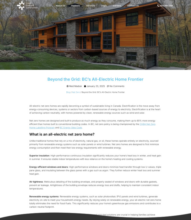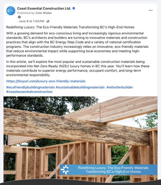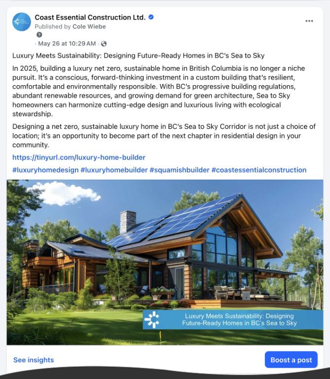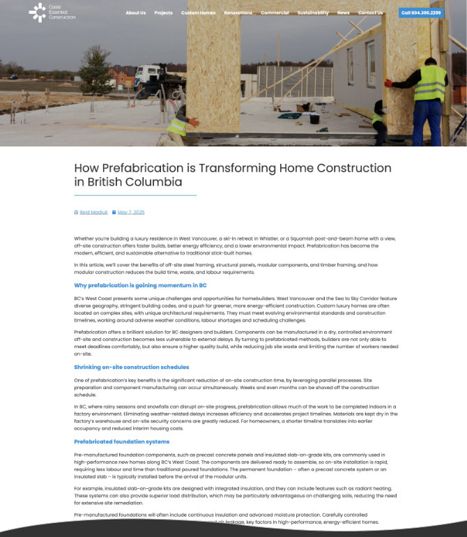 Over the years I have ghostwritten content for the Coast Essential Construction blog and Medium platform in Reid's name, posted to Facebook and Instagram, created lead magnets and landing pages, and redesigned and built the website (launched May 13, 2025).